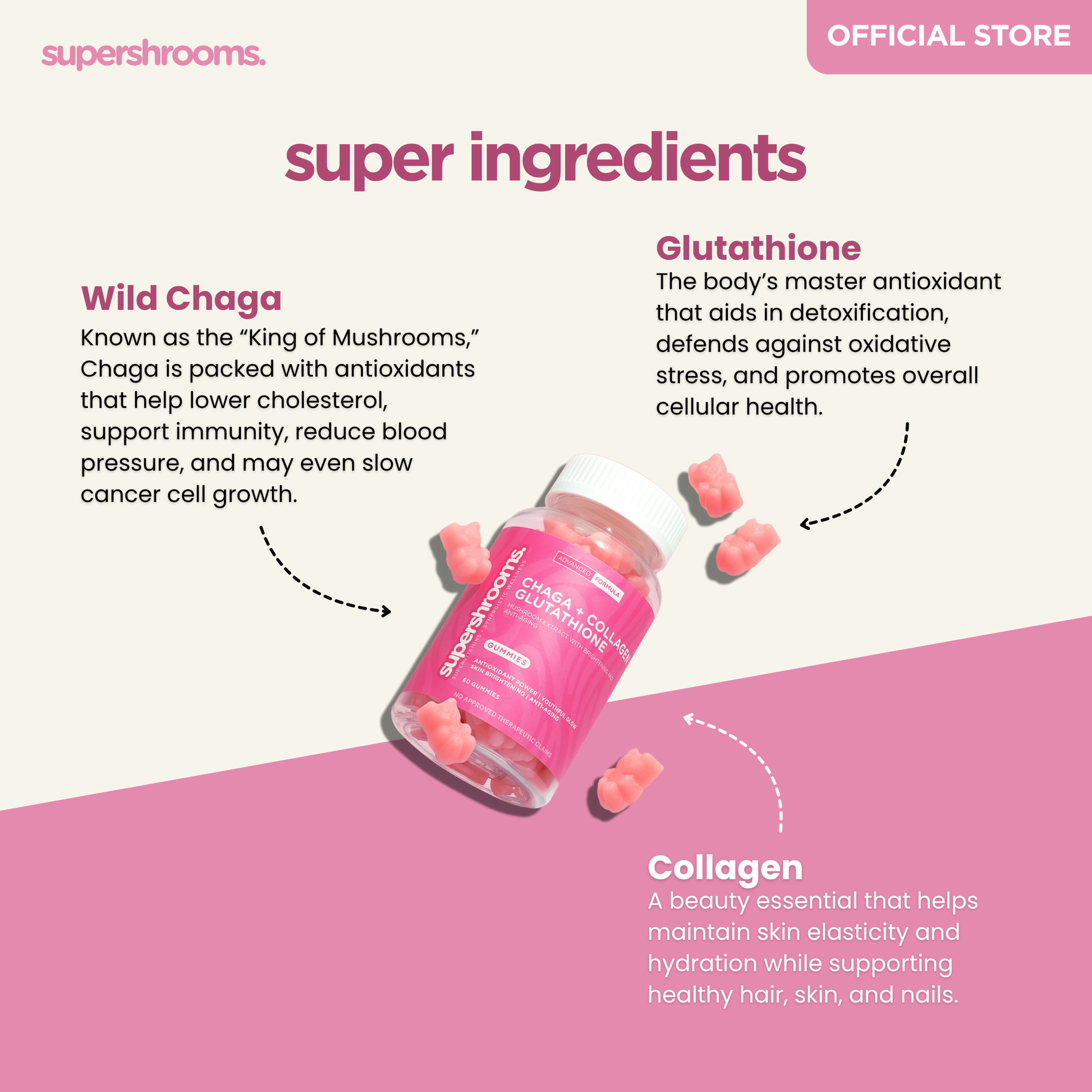 Glutathione, alongside Chaga's antioxidants and collagen's skin support, reduces dark spots and promotes a radiant complexion by inhibiting melanin production.