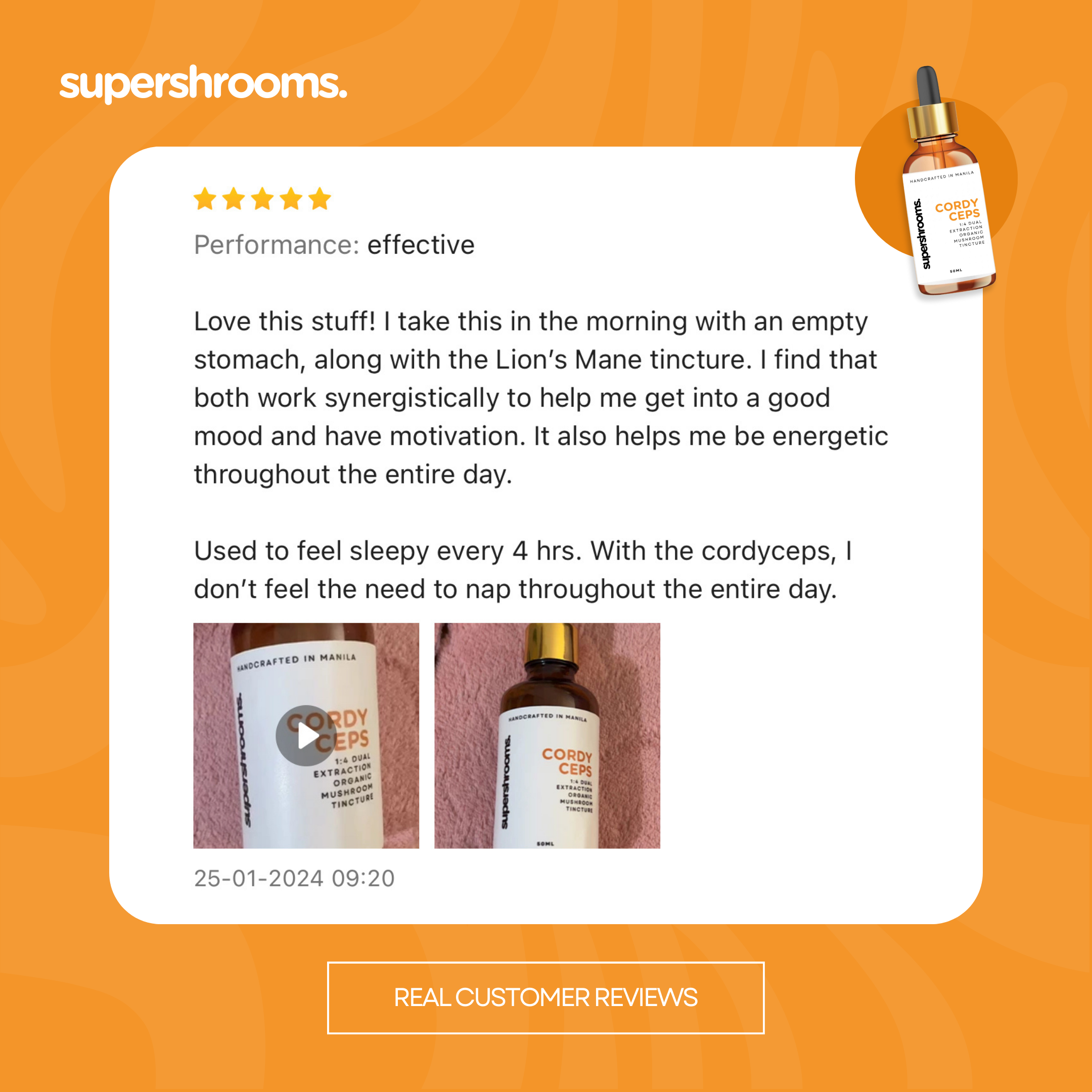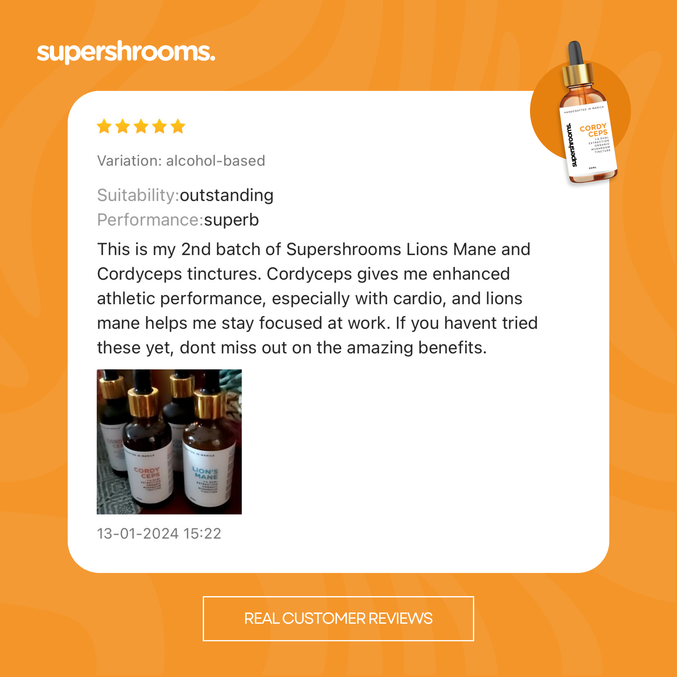 This is my 2nd batch of Supershrooms Lions Mane and Cordyceps tinctures. Cordyceps gives me enhanced athletic performance, especially with cardio, and lions mane helps me stay focused at work. If you havent tried these yet, dont miss out on the amazing benefits.