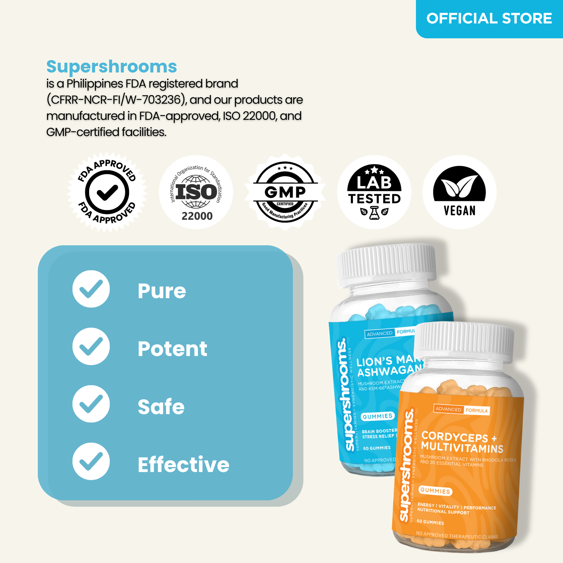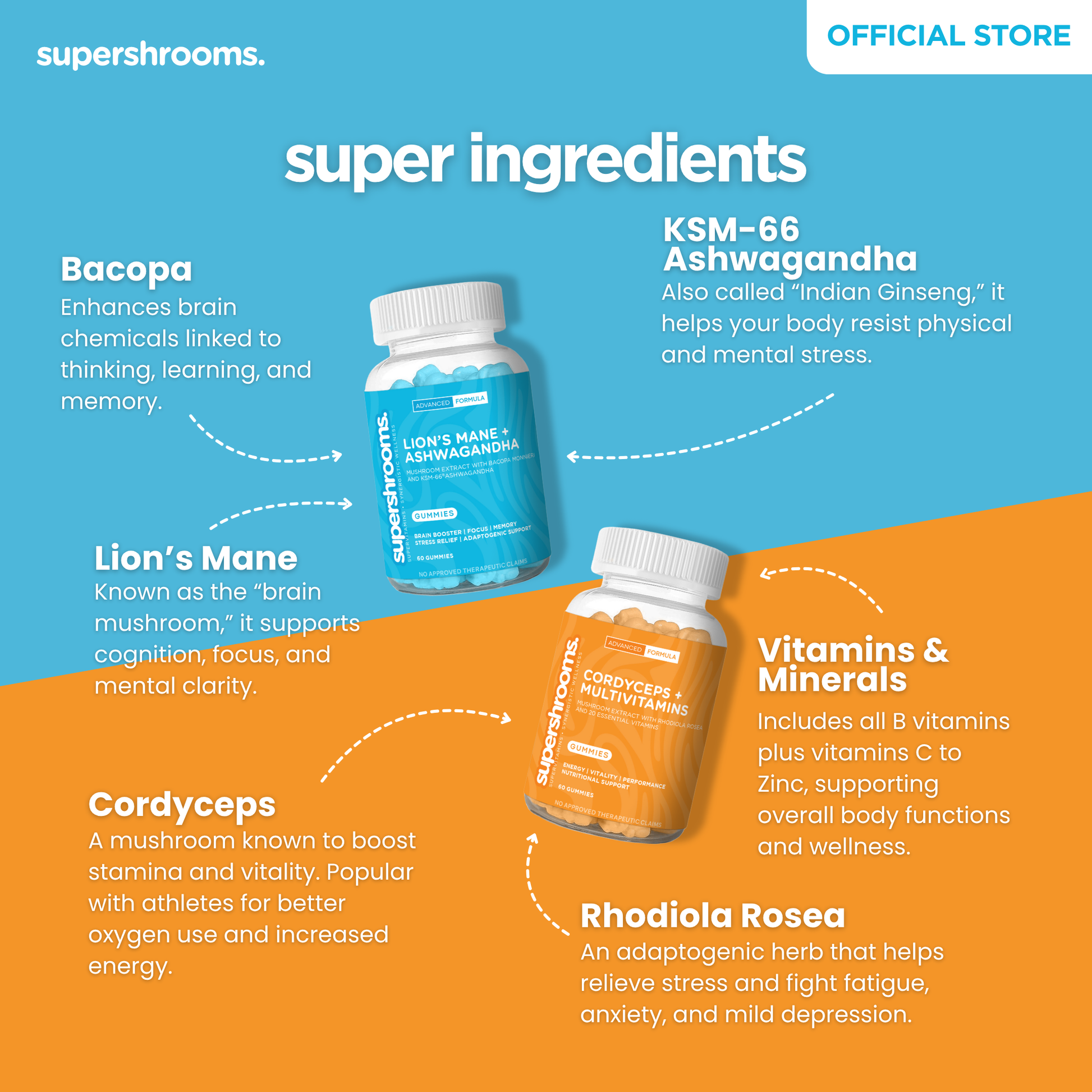 CordycepsA mushroom for natural energy, Cordyceps contains cordycepin and adenosine, compounds that support oxygen utilization and ATP (energy) production in cells. This helps improve stamina, endurance, and recovery, giving you steady, jitter-free energy throughout the day.