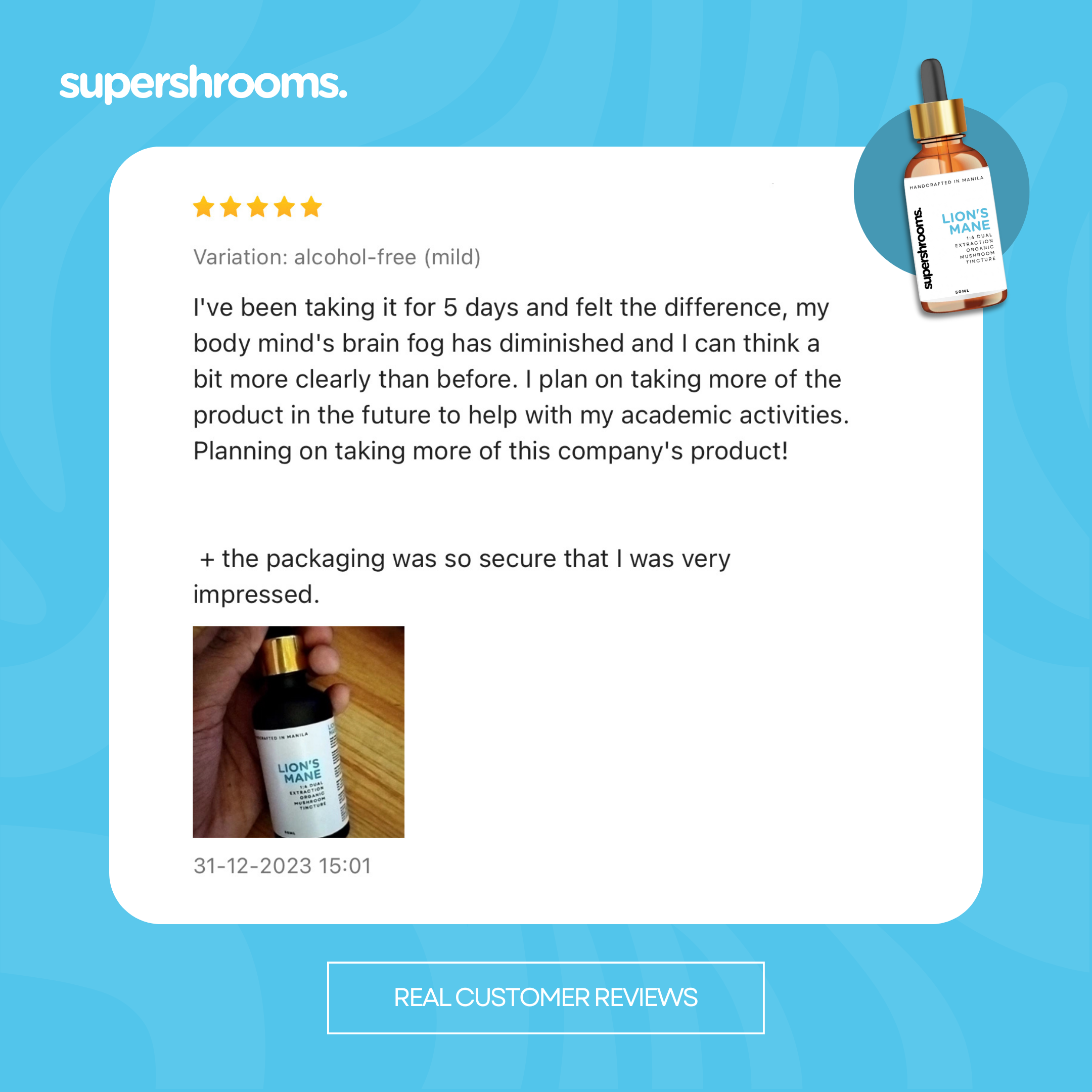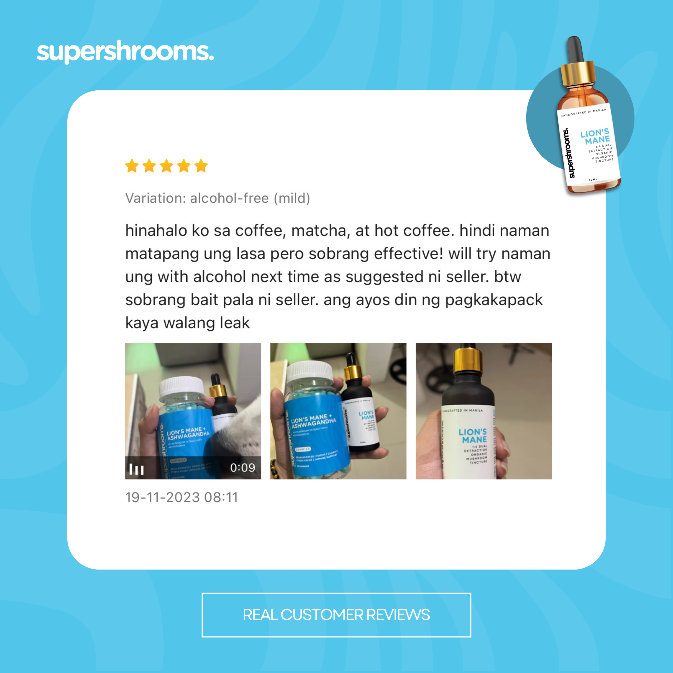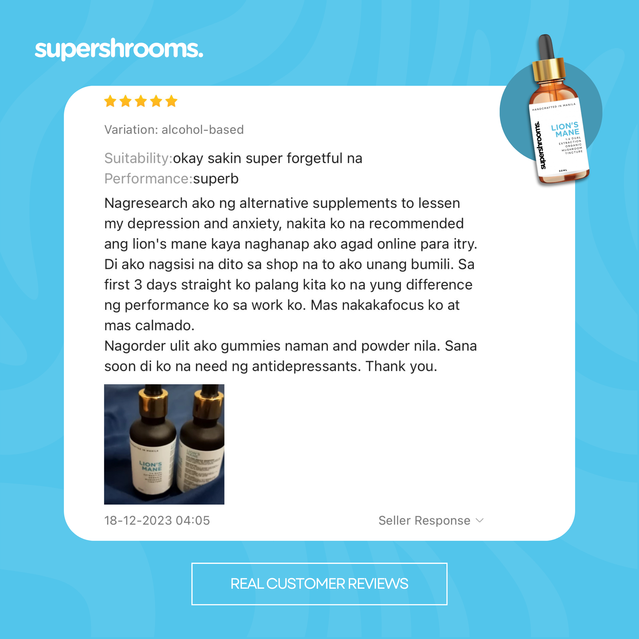 Nagresearch ako ng alternative supplements to lessen my depression and anxiety, nakita ko na recommended ang lion's mane kaya naghanap ako agad online para itry. Di ako nagsisi na dito sa shop na to ako unang bumili. Sa first 3 days straight ko palang kita ko na yung difference ng performance ko sa work ko. Mas nakakafocus ko at mas calmado. Nagorder ulit ako gummies naman and powder nila. Sana soon di ko na need ng antidepressants. Thank you.