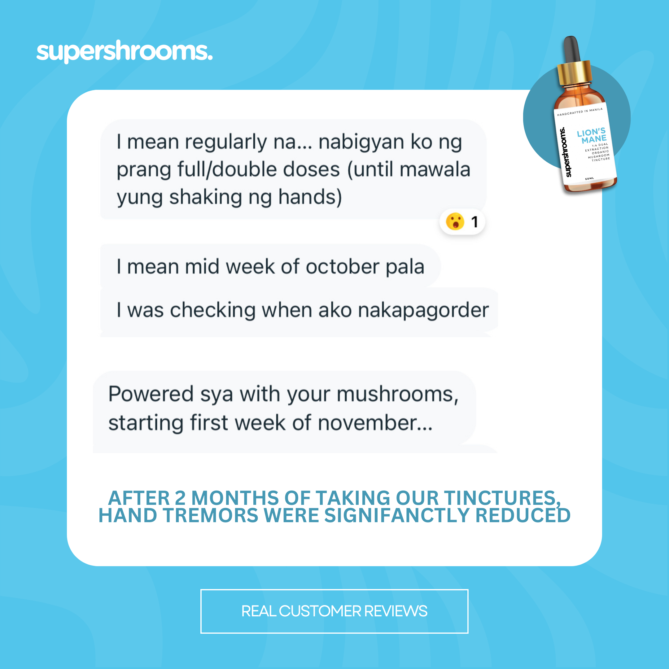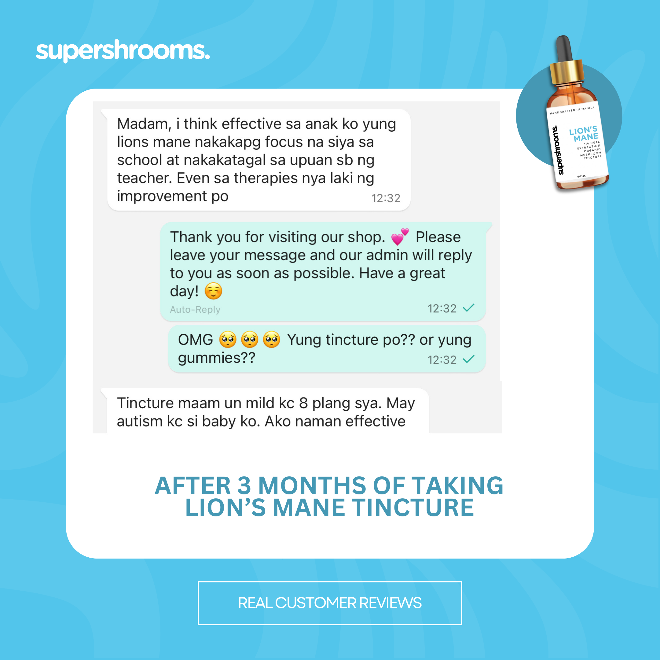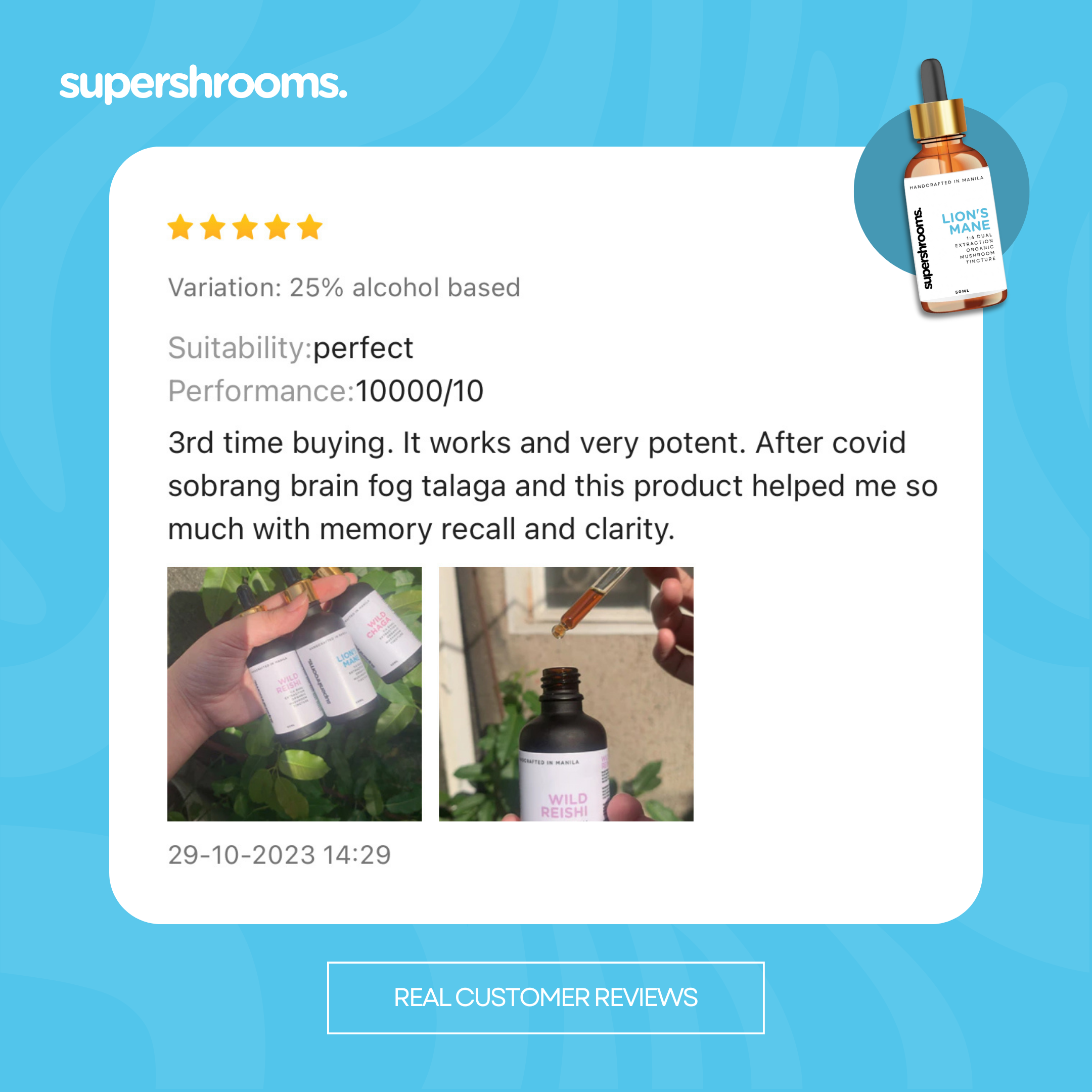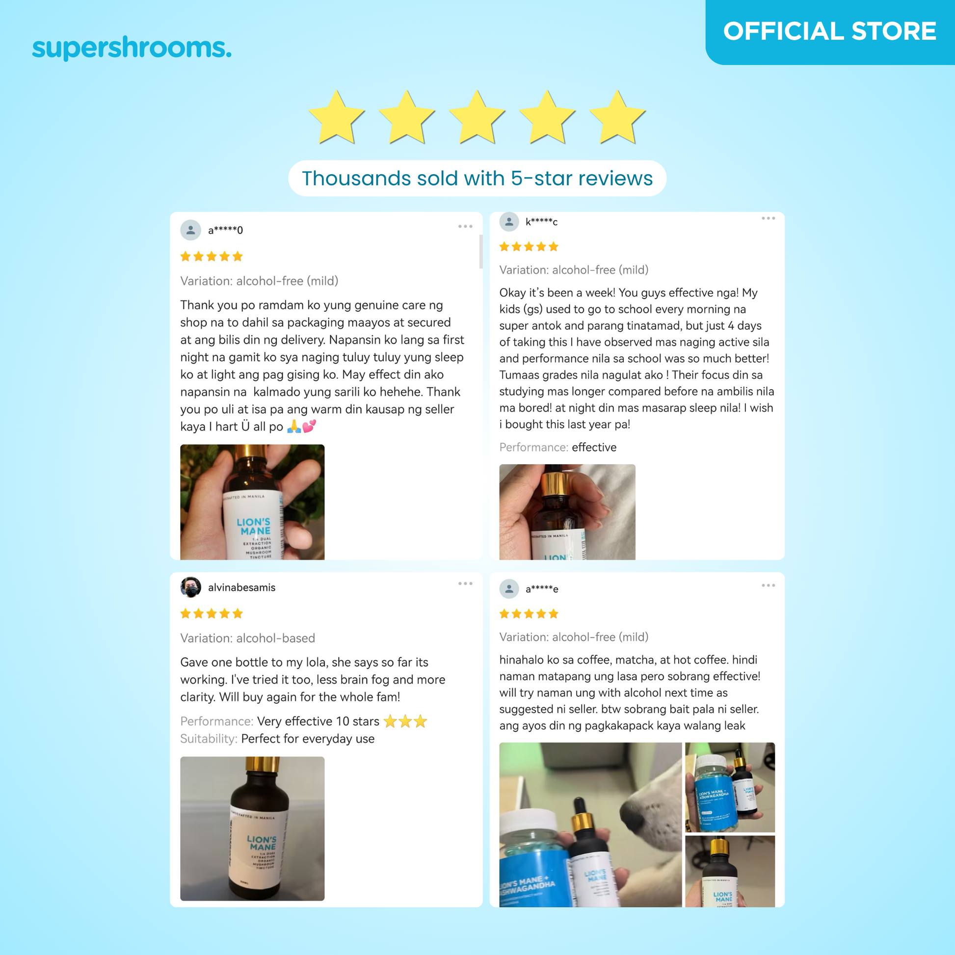 Nagresearch ako ng alternative supplements to lessen my depression and anxiety, nakita ko na recommended ang lion's mane kaya naghanap ako agad online para itry. Di ako nagsisi na dito sa shop na to ako unang bumili. Sa first 3 days straight ko palang kita ko na yung difference ng performance ko sa work ko. Mas nakakafocus ko at mas calmado. Nagorder ulit ako gummies naman and powder nila. Sana soon di ko na need ng antidepressants. Thank you.