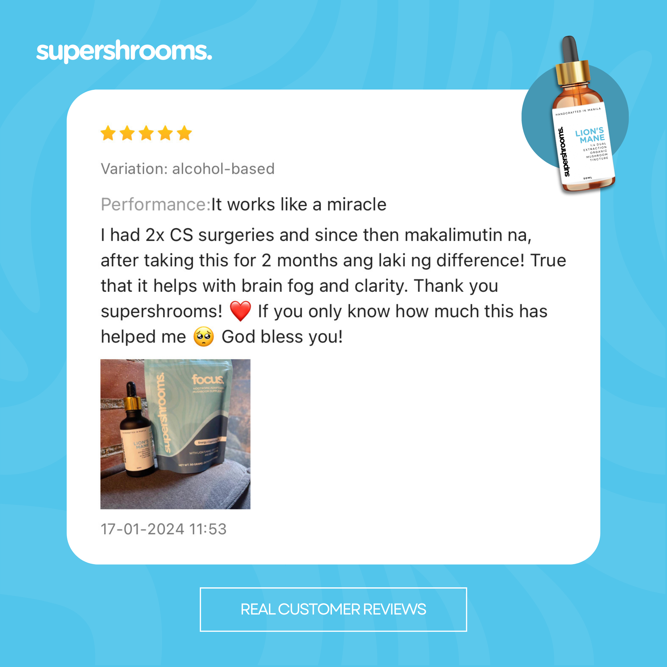 I had 2x CS surgeries and since then makalimutin na, after taking this for 2 months ang laki ng difference! True that it helps with brain fog and clarity. Thank you supershrooms! If you only know how much this has helped me God bless you!
