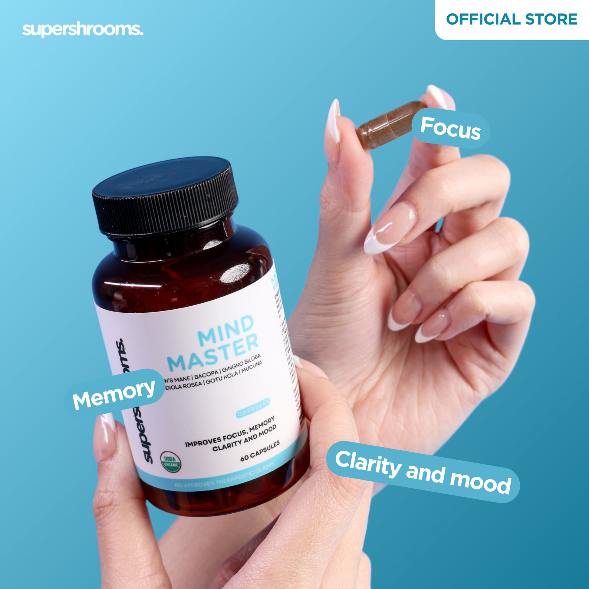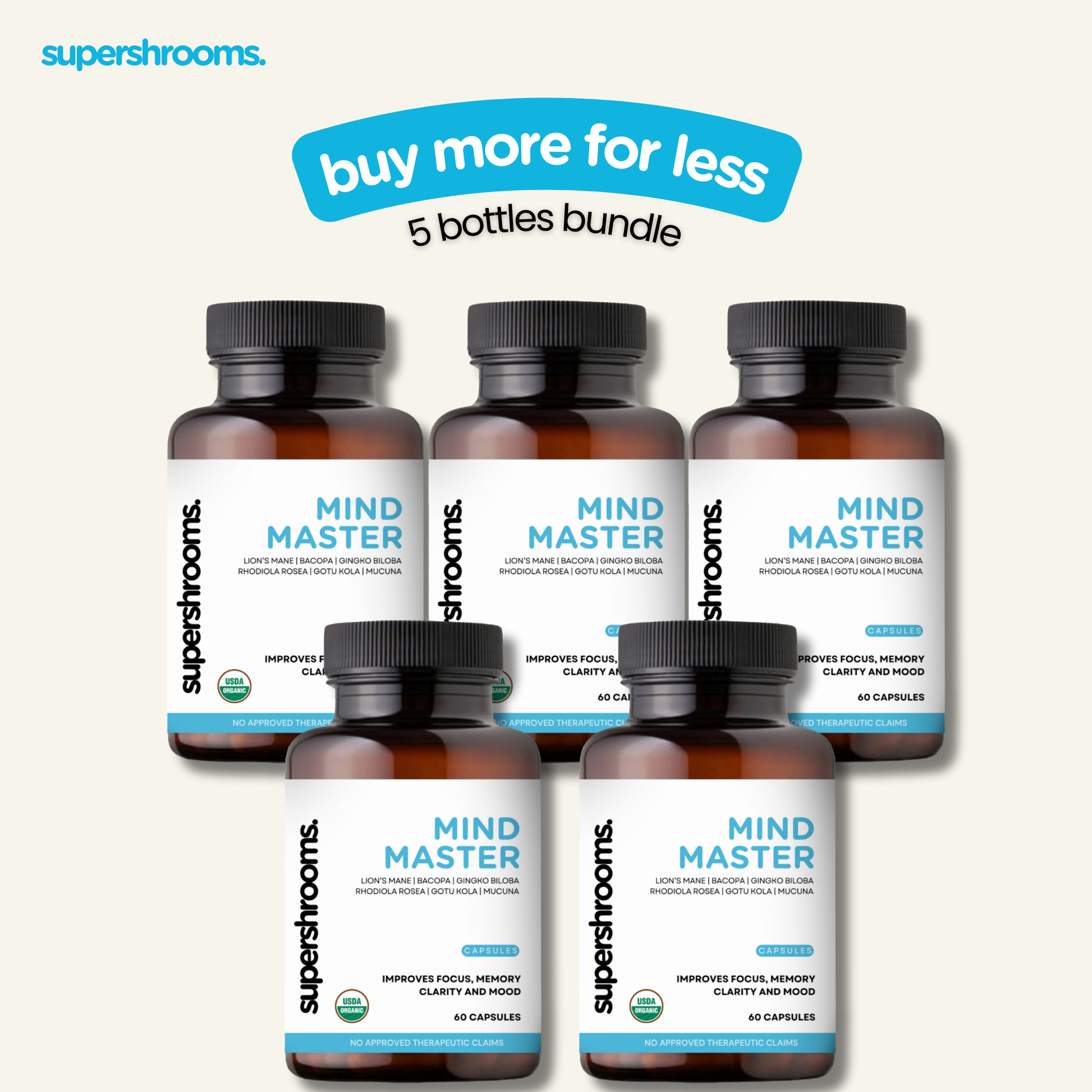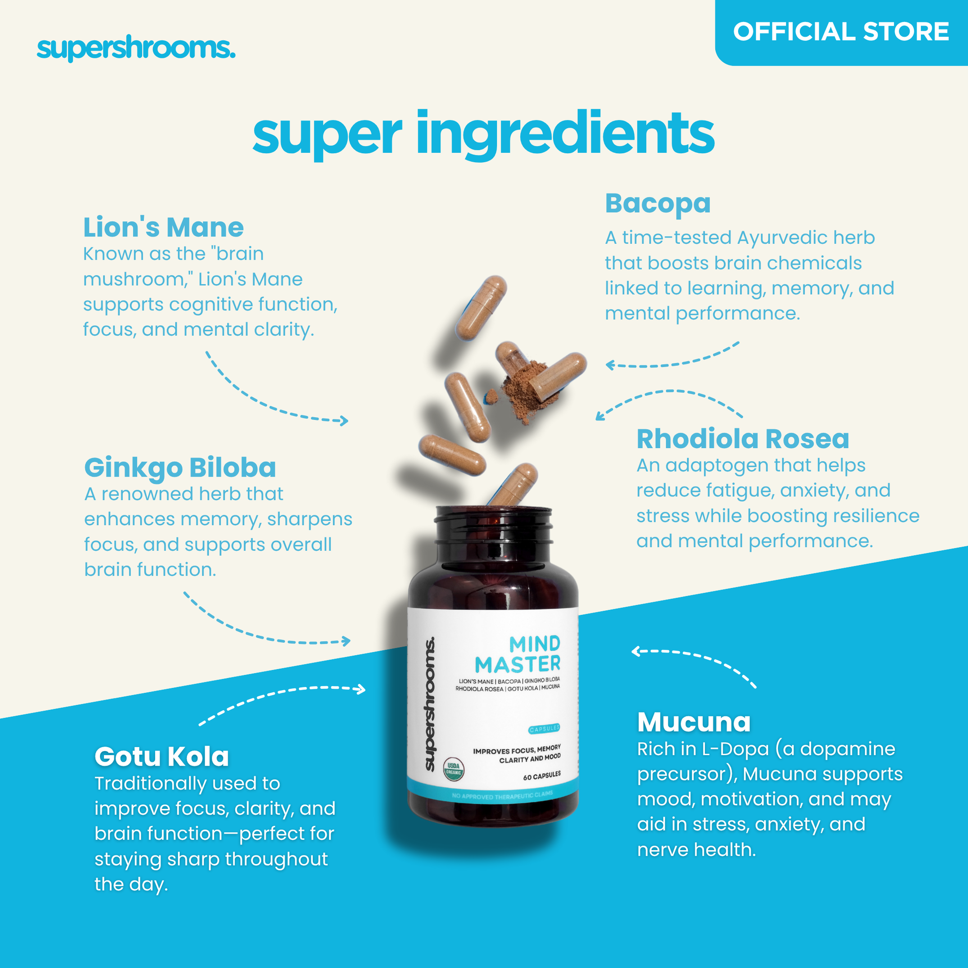 Master your mind with Mind Master! Combining potent lion's mane, bacopa, gingko biloba, rhodiola rosea, gotu kola, and mucuna, this formula enhances focus, memory, clarity, and mood. Get ready to unlock your full potential with Mind Master!