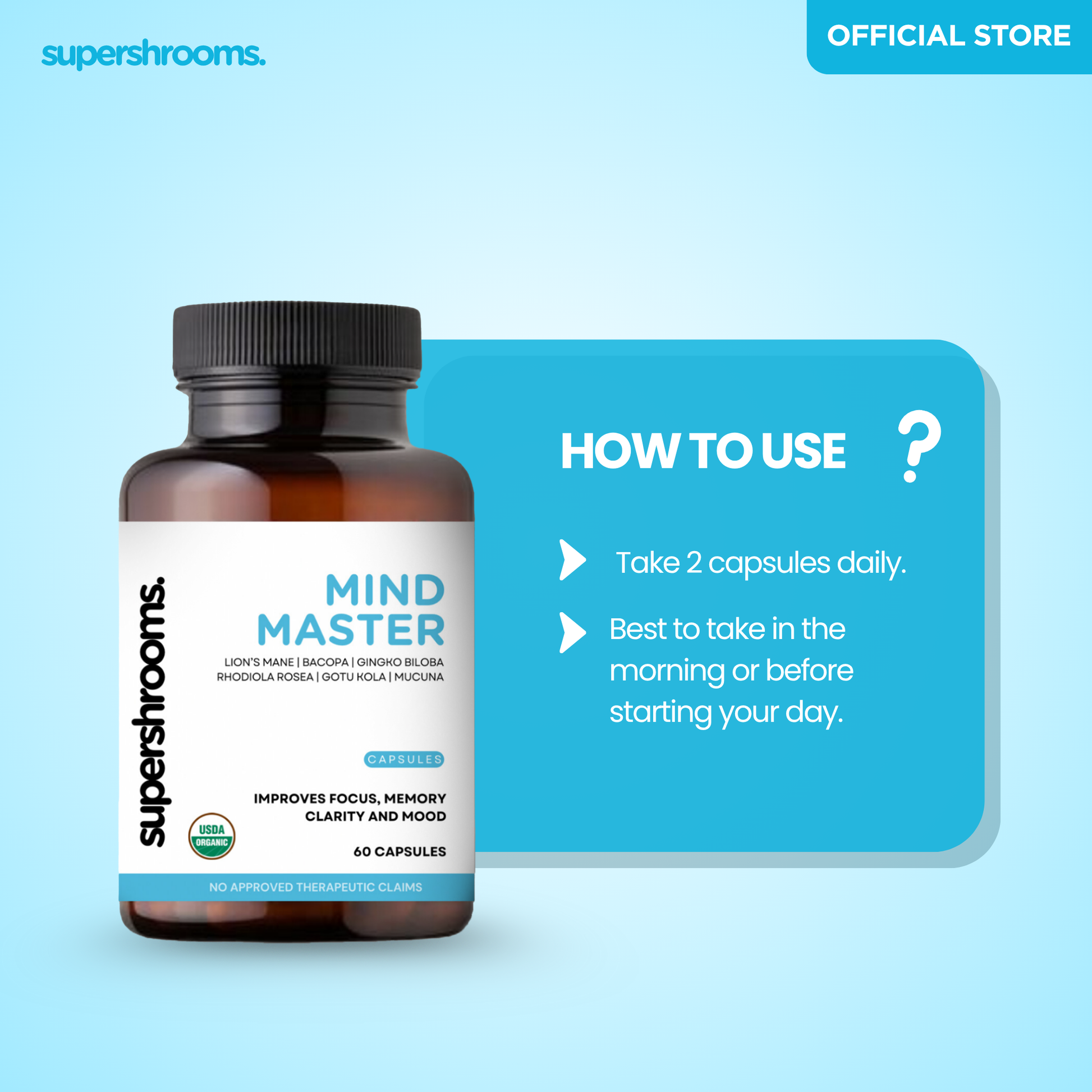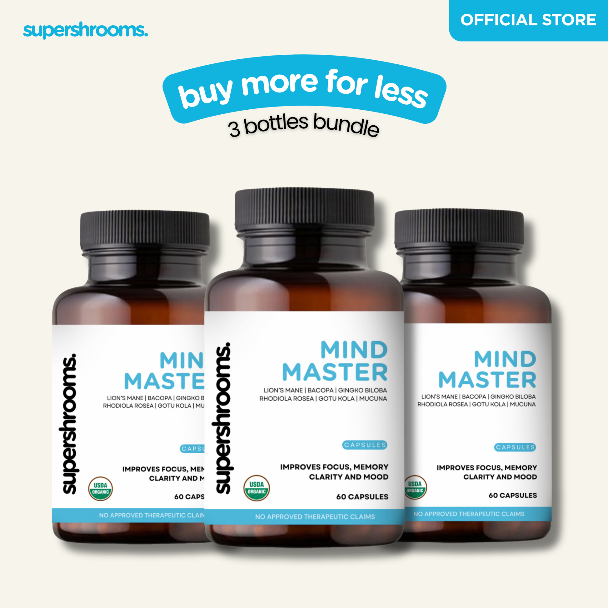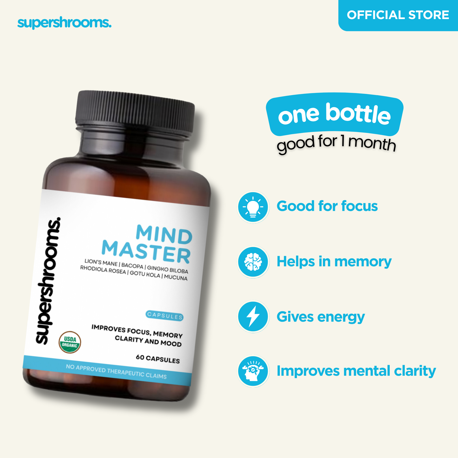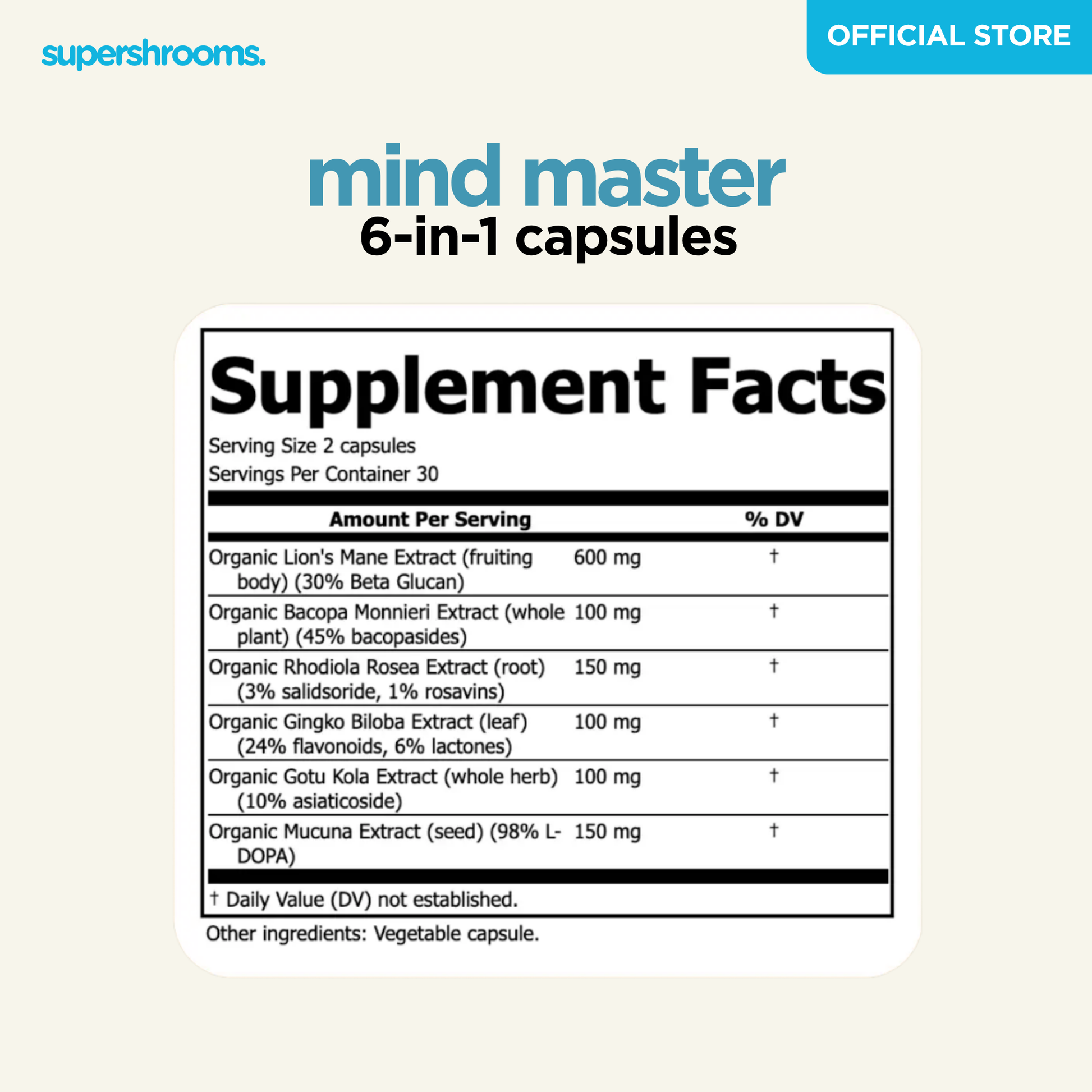 Master your mind with Mind Master! Combining potent lion's mane, bacopa, gingko biloba, rhodiola rosea, gotu kola, and mucuna, this formula enhances focus, memory, clarity, and mood. Get ready to unlock your full potential with Mind Master!