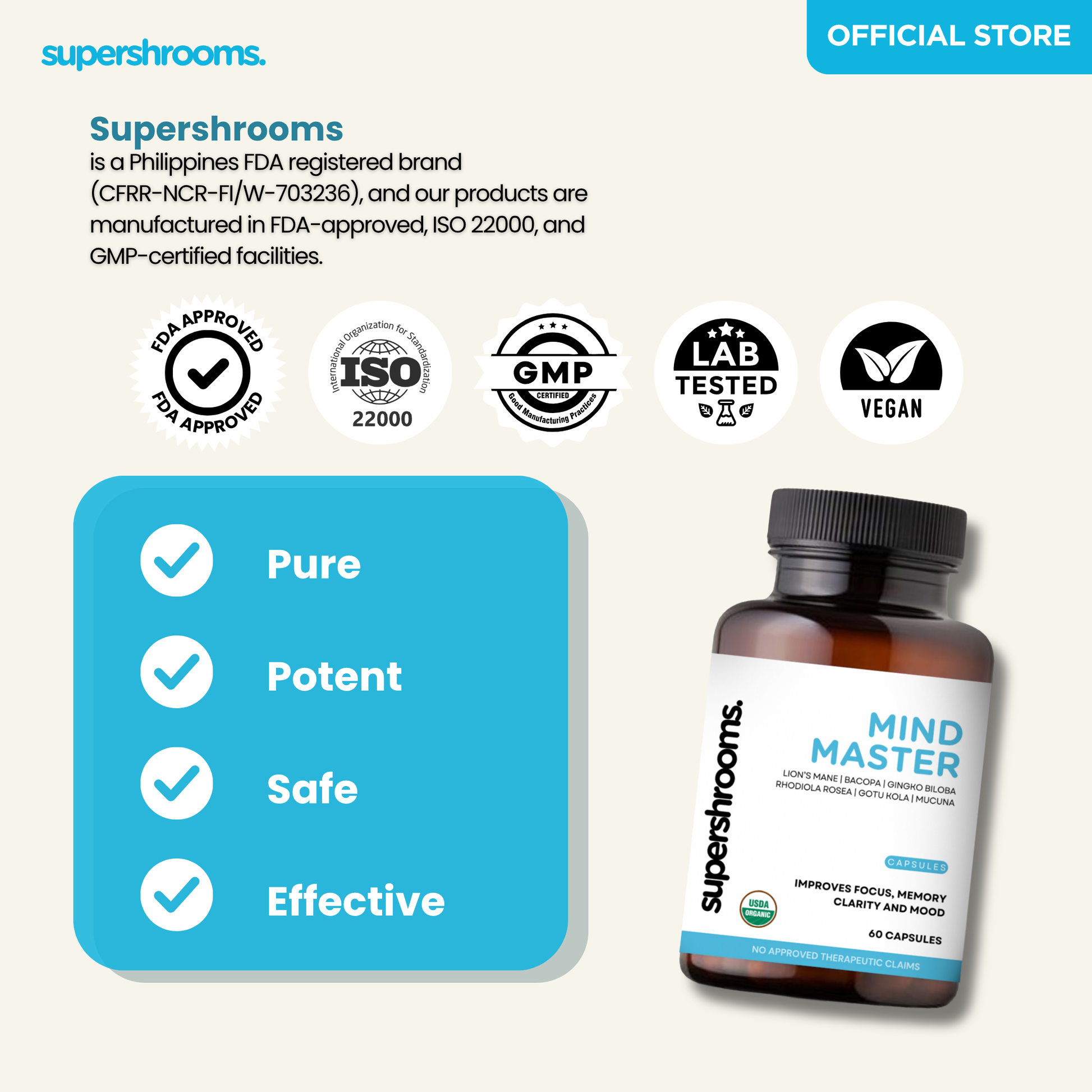 Supershrooms is a prominent brand in the Philippines known for its mushroom-based food supplements and vitamins. Our products are formulated with some of the world's most potent mushrooms, including Lion's Mane, Cordyceps, Turkey Tail, Chaga, and Reishi. We offer a variety of products such as tinctures, gummies, and premium blends of powdered extracts. Our products are plant-based and derived from natural sources. We aim to elevate the country's health and wellness industry to new heights through the power of mushrooms.